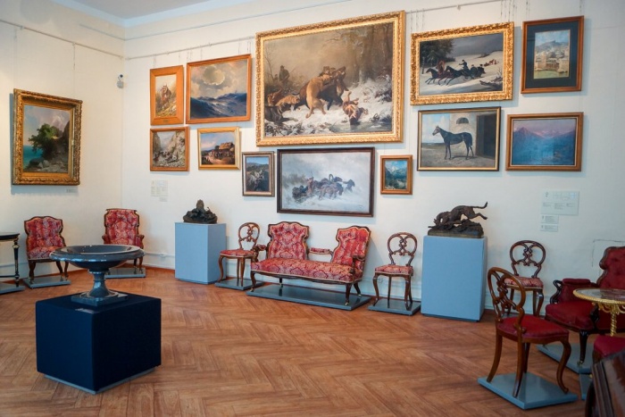 Когда картины вот так плотно покрывают стену, это называется шпалерная развеска. Здесь демонстрируются работы из коллекции Михаила Николаевича, сына Николая I.