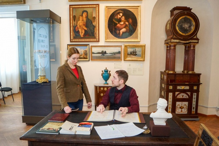 В соседнем зале у гостей музея есть возможность присесть за исторический стол. Здесь лежат книги и альбомы по истории музея, которые можно полистать, тут же находится книга отзывов и предложений.