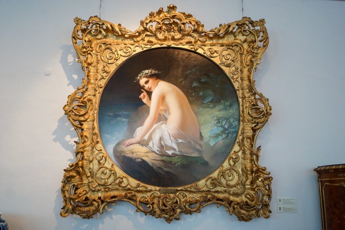 Кстати, эта работа выставляется в подлинной раме, как и многие другие картины в экспозиции. Многие «родные» рамы живописных работ были отреставрированы специально к проекту «12 стульев из дворца».