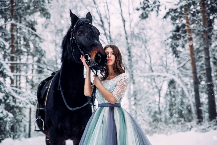 Модель в черном платье под белым снегом тоже выглядит романтично. А черный конь, готовый унести красавицу за тридевять земель, создает особое сказочное настроение.