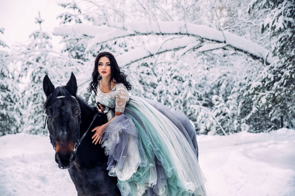 Иней у лошади на морде говорит, что мороз был нешуточный. Но девушки в легких платьях выглядят нежно и романтично. Такой стойкости, а точнее, морозоустойчивости, моделей можно только позавидовать.