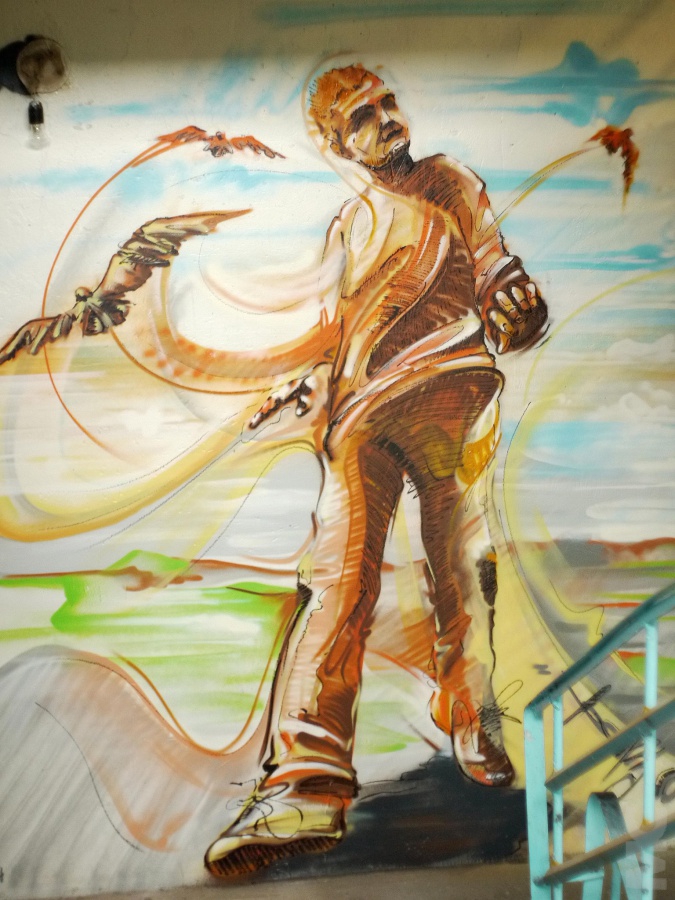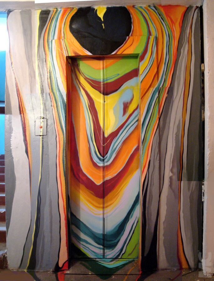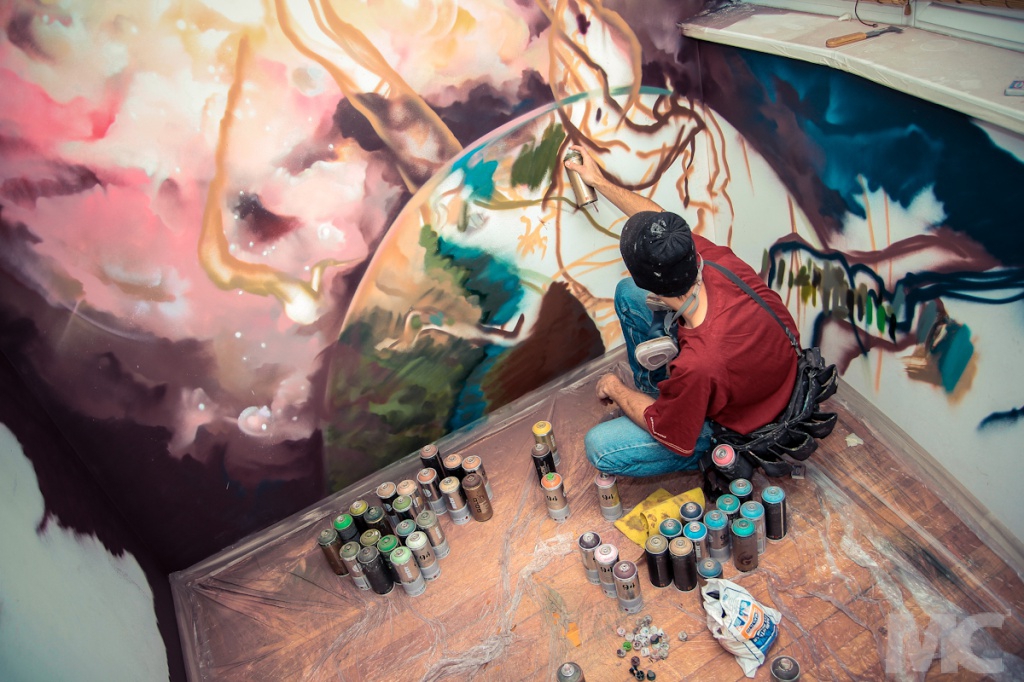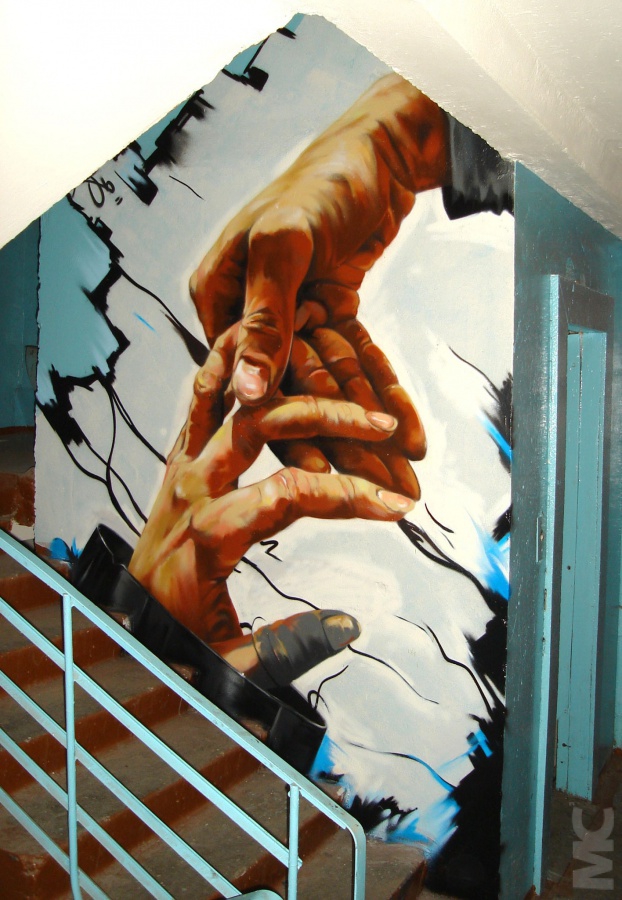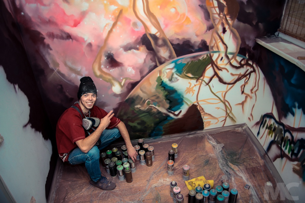 Баллон впервые в руки я взял году в 2004-м. Ко мне в гости пришел друг и предложил «похулиганить» на улице. Позже перешел на граффити, а после уже захотелось какого-то более осознанного творчества, что-то более художественное рисовать. Через некоторое время я решил «облагородить» наш подъезд – разрисовал лестничный пролет. Выглядело это… ммм… немного безобразно, соседи были в шоке, так как изначально они выступали против такой затеи. Года через три там сделали ремонт, к тому времени я поднаторел и снова разрисовал лифт. Только на этот раз моя работа соседям понравилась. Через какое-то время поступил заказ от другого жилого дома, старшая по дому через КТОС меня нашла – попросила оформить их дом.