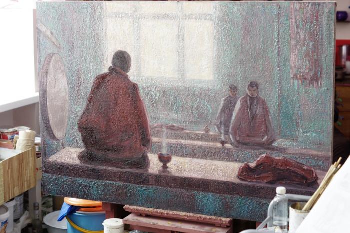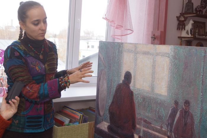 Ольга рассказывает о посещении буддийского храма. Впечатления вылились в картину, которую она представляла на выставке-конкурсе «Лучшее художественное произведение-2016 года» в январе.