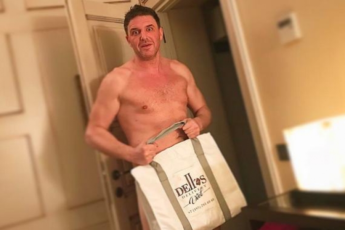 Правда, рассмотреть во всех подробностях тело кумира поклонники не смогут, все самое интимное он прикрыл бумажным пакетом. Тем не менее можно заметить, что его регулярные занятия в спортзале не прошли даром.