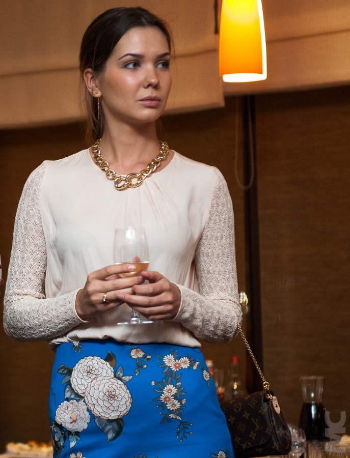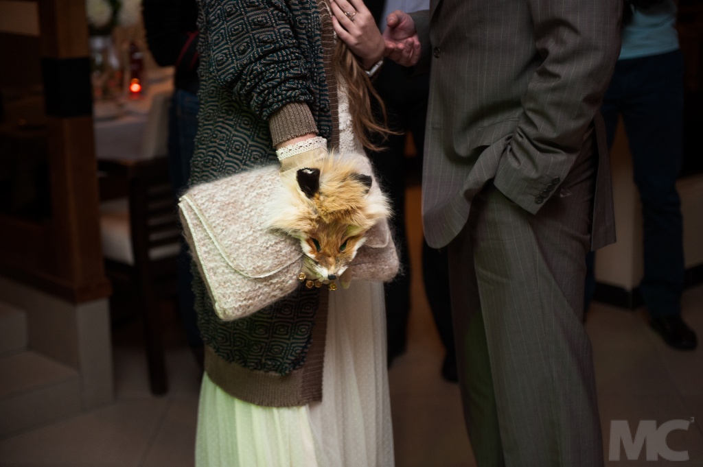 Самым ярким аксессуаром этого вечера стал вязаный клатч цвета слоновой кости, принадлежащий Наталии Сушко (творческий конгломерат «Сушко, Киселева и Партнеры»). Венчала его голова лисы, которая помимо декоративного назначения еще и выполняла функцию нетривиальной ручки. Стоит отметить, что на руке, в которой Наталия держала клатч, красовалась одинокая перчатка-митенка с отделкой из тонкого кружева.