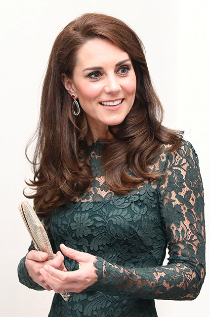 Для выхода в свет жена принца Уильяма выбрала длинное темно-зеленое кружевное платье от британского бренда Temperley. Образ она дополнила золотистым клатчем и сережками от английского ювелирного дизайнера Kiki McDonough, сообщает spletnik.ru.