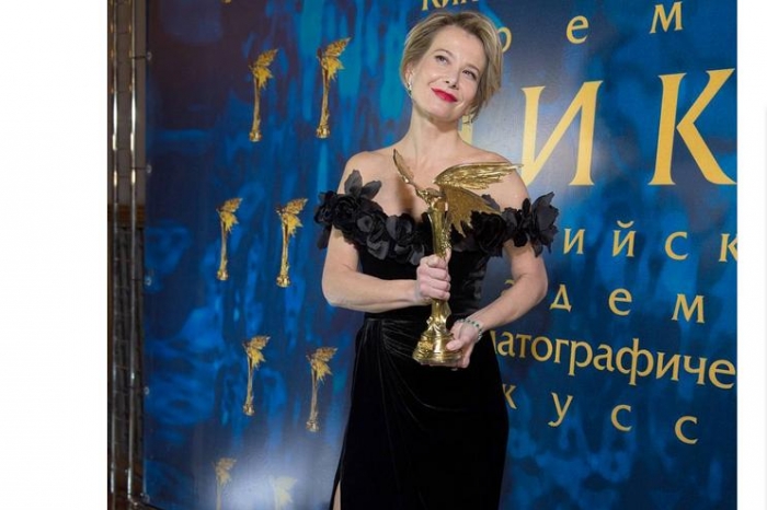 В белом платье-футляре на тонких бретелях получала статуэтку Надежда Оболенцева.