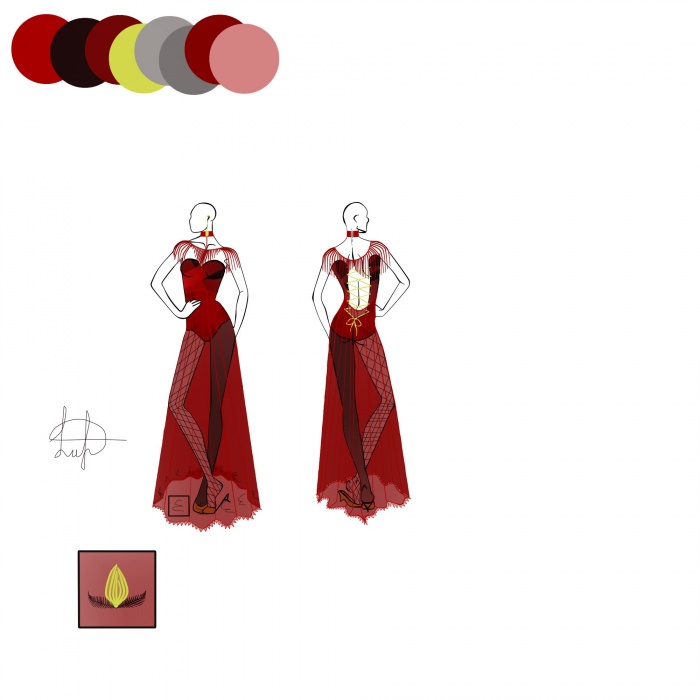 Кстати, второй эскиз Олеси Бачиной не менее интересен. Она придумала наряд, который состоит из красного боди со шнуровкой на спине, украшенного в верхней части бахромой и прозрачной юбки с вышитым на подоле желтым цветком. Образ дополняет красно-желтый чокер.