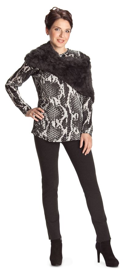 Элегантный образ для светского выхода. Пальто с воланом из стопроцентного кашемира, шелковая блуза с принтом, стилизованным под рептилию, в сочетании с юбкой-футляром и широким поясом отлично подчеркивают стройную фигуру.