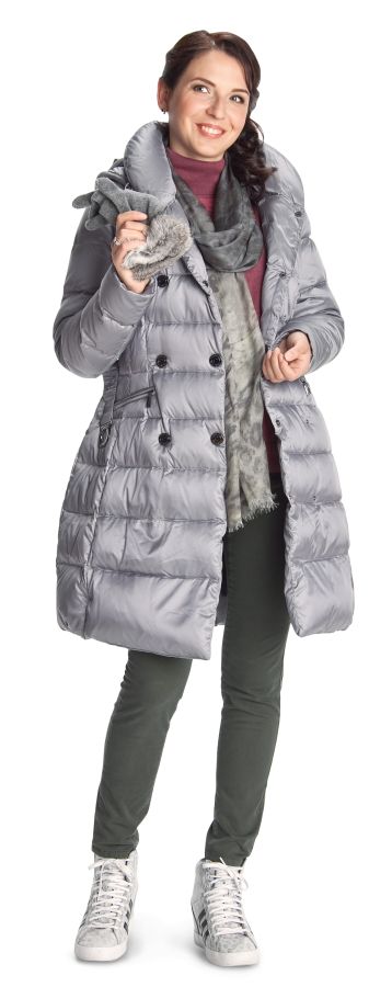 Спортивный casual. Для прогулок с ребенком. Насте подобрали комплект в припудренных тонах, стильный пуховик жемчужно-серого оттенка, джинсы skinny оттенка темной зелени и мягкий джемпер. Дополняют образ перчатки с отделкой из меха – важный аксессуар осени.