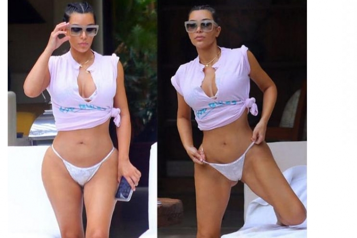 Видимо, Ким решила убедить общественность в том, что у нее на самом деле все отлично. К микротрусикам она надела майку, которую завязала под грудью, чтобы подчеркнуть плоский животик. А сверху на майке был сделан надрез, очевидно, для демонстрации пышной груди.
