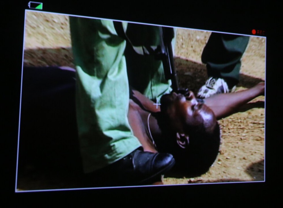 Кадр из фильма Сергея Ястржембского о задержании браконьера, нелегально охотящегося на слонов ради слоновой кости. Этот фрагмент снят на скрытую камеру, как и некоторые другие в ленте Ястржембского. В фильме уверяют, что, если бы не съемочная группа, человека, лежащего на земле, скорее всего бы убили. Законодательство по борьбе с теми, кто губит слонов, в Африке слишком мягкое.