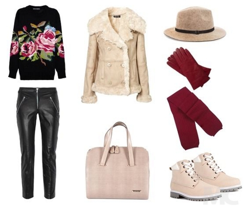 Повседневные дела удобнее всего решать в не доставляющей дискомфорта и не сковывающей движения одежде. Джинсы и свитер темных оттенков будут отлично гармонировать со светлой дубленкой молочно-бежевой гаммы и нежно-розовыми сумкой и обувью. Контраста добавят малиновые шарф и перчатки. Чтобы сделать образ более стильным, замените шапку на шляпу-федору спокойного оттенка, лента на которой будет сочетаться с низом - темно-синими или черными джинсами или утепленными леггинсами. Яркая помада вишневого или винного оттенка завершит образ.