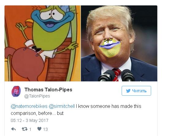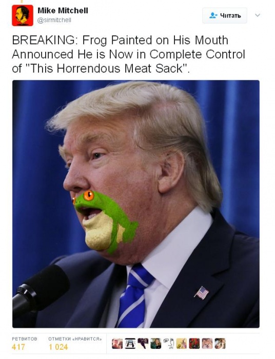 Первым, что разглядел, что подбородок президента США можно превратить в забавную лягушку, стал художник из Техаса Майк Митчел, пишет Life. Шутник разрисовал фото президента в «Фотошопе» и выложил в «Твиттере» со словами: «Срочная новость! Дональд Трамп представляет нового члена правительства – лягушонка, нарисованного на его лице».