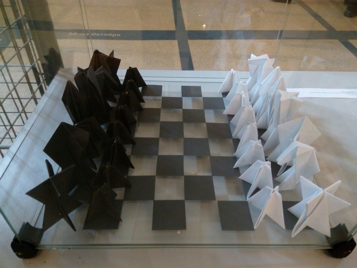 Или шахматы, фигуры которых сложены из бумаги в стиле оригами.