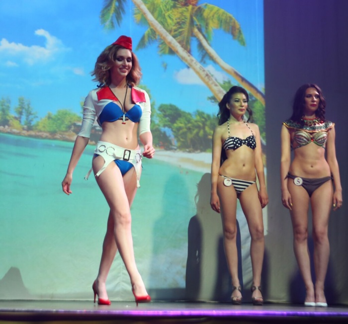 Но для самого жаркого выхода – в купальниках – девушки одевались сами. Здесь будущая победительница, Ольга Кузнецова отличилась, пройдясь по сцене не в обычном купальнике, а в оригинальном костюме, который, кстати создала сама.