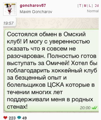 - Переход Максима Гончарова в омский «Авангард» стал для 24-летнего защитника ЦСКА полной неожиданностью. Он узнал о своем обмене из СМИ. Ну что ж, теперь московскому молодцу придется привыкать к условиям жизни в Сибири. Хотя, по заявлениям самого Максима, он совершенно спокойно относится к этому факту, главное для него - играть в хоккей. Однако помимо хоккея у него должны быть и другие увлечения? А кто может помочь разобраться в этом вопросе, если не Instagram? Редакция «МС2» решила заглянуть в профайл спортсмена и узнать, как он проводит свободное от тренировок время.