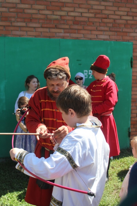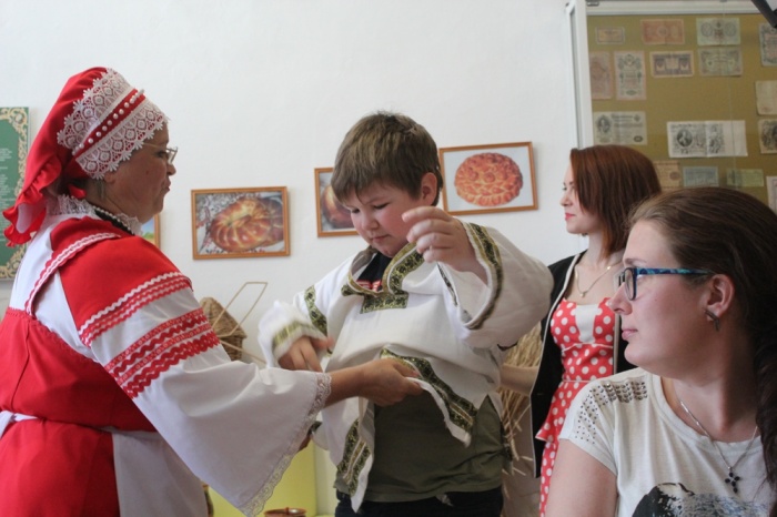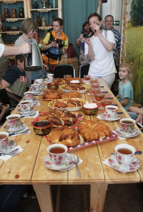 Прошлое встретило радушно – накрытым столом с чаем и калачами. Чтобы соответствовать эпохе желающие смогли переодеться в рубахи и сарафаны.