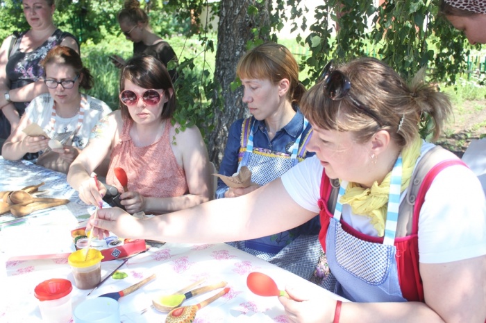 Девушки в это время отправились в тенёк расписывать деревянные ложки под руководством местной мастерицы.