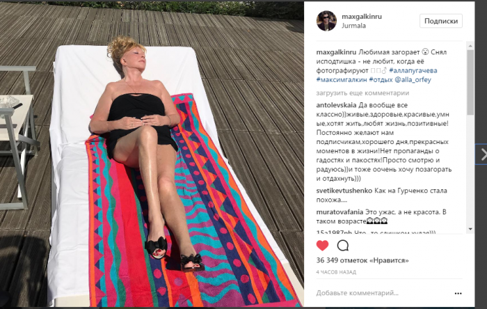 Звезда принимала солнечные ванны в Юрмале, где сейчас находится с семьей. При этом на фото Пугачева выглядит так, будто только вышла из spa-салона.