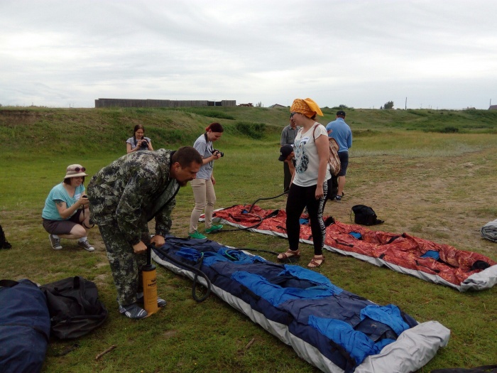 Однако перед тем, как сесть в трех- и четырехместные байдарки модели «Щука», нужно было подготовить их, то есть надуть воздухом баллоны, благодаря которым байдарка держится на воде. Для этого использовались ручные и ножные насосы.