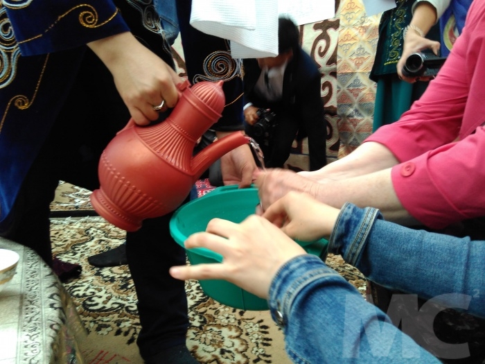 Перед трапезой и после нее проводится ритуал омовения рук. Человеку, который помогает в этом гостям, принято желать долгих лет и других благ