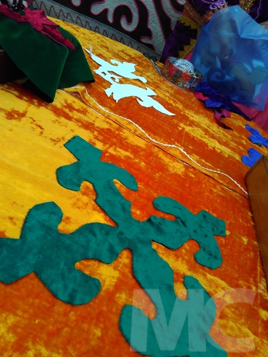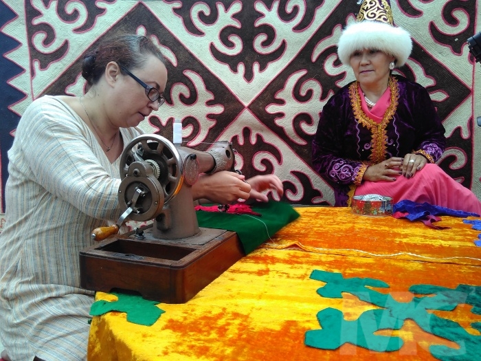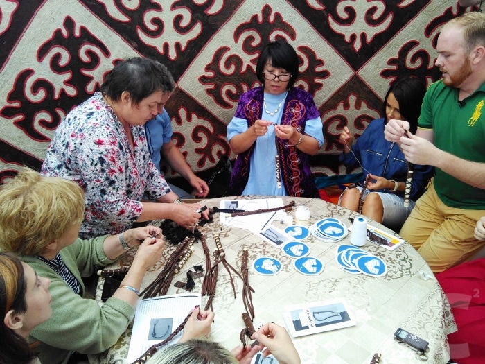 Подушка получается не просто подушкой: в каждый шов вложены материнские пожелания. Для туристов провели мастер-класс: дамам предложили сшить на машинке основу для подушки (элемент орнамента, который тоже имеет свое значение, был вырезан заранее), а мужчинам (правда, в эту группу затесались и девушки) – создать плетку-камчу. Она считается вещью, придающей силу, отец должен сделать ее для каждого сына.