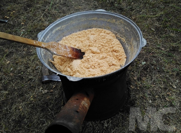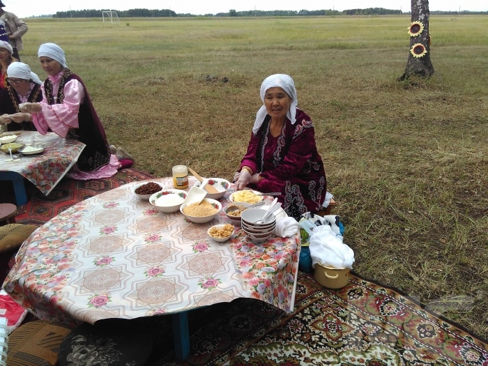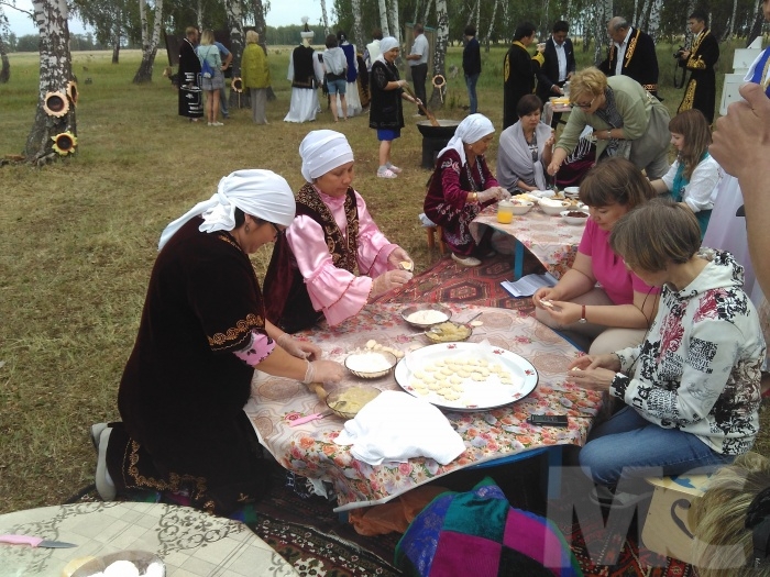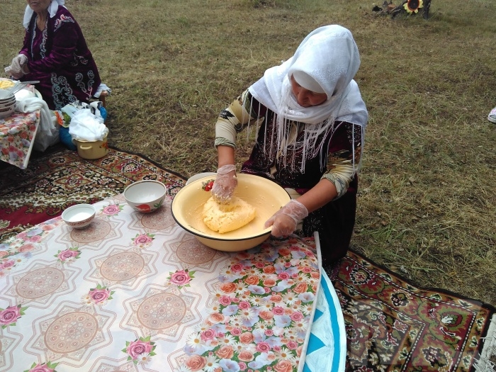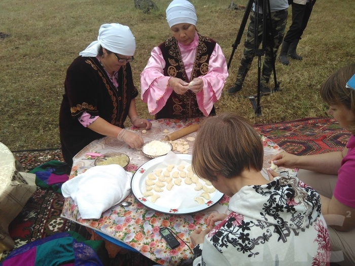 И, конечно, не обошлось без плотного знакомства с национальной кухней, причем не только ее вкусовыми качествами, но и процессом приготовления. Любой желающий мог посмотреть, как в огромном котле варится курт (процесс длится 5 часов), поучаствовать в процессе подготовки пластов теста для бешбармака, лепке пирожков и баурсаков, а также создании еще одного необычного лакомства. Коспа, как и курт, делается из прокисшего молока, к этой вкусности добавляется изюм, масло и другие ингредиенты. Коспа, которую готовит местная мастерица Батима Курмашева, настолько полюбилась экскурсантам, что они увезли ее с собой в Омск, дабы порадовать близких. Прежде чем отправиться к обеденному столу, гости понаблюдали, как готовятся в кипящем масле слепленные ими пирожки и баурсаки, а также как варится основное блюдо - бешбармак.