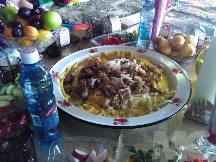 А вот и главное блюдо обеда - бешбармак. К нему подается бульон - сурпа. Каждый желающий может налить себе кумыс