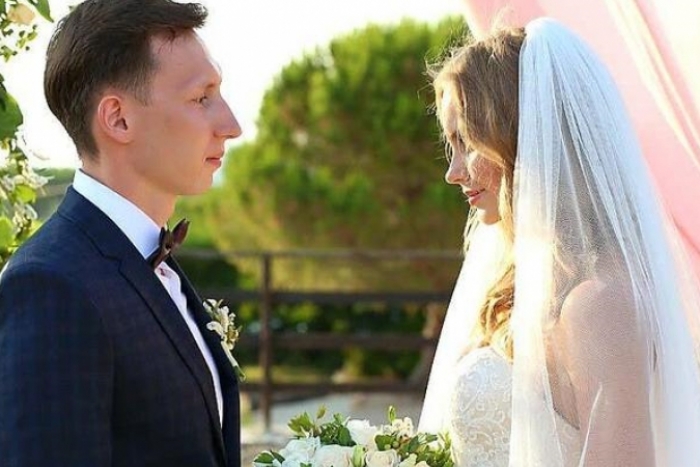 В день бракосочетания на Аделии было классическое белое платье и фата. Букет невесты был составлен из белых роз.