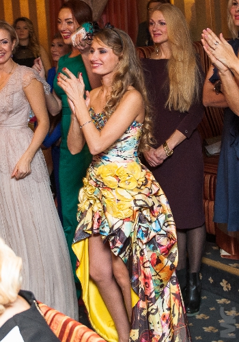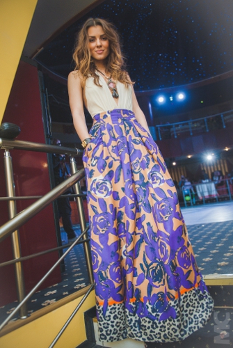 Крайне смелое, но очень интересное платье «выгуляла» дизайнер Анна Долганева (Dolganeva sisters). Откровенный вырез на груди не открыл взору присутствующих ничего лишнего и был удачно обыгран массивным колье в этническом стиле. Цветочно-леопардовый принт, безусловно, стал одним из самых ярких и запоминающихся из всех, что можно было увидеть на гостях конкурса.