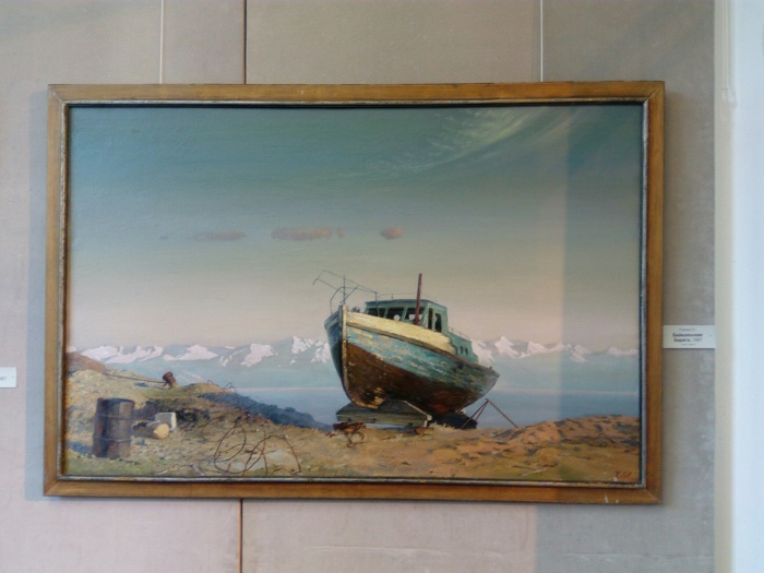 Я увидел этот старый корабль, мне так нравилось его прописывать, мастихин я тут использовал. Но еще я вложил экологический подтекст. Вот там, вдалеке, белые горы - это Хамар-Дабан, белизна, чистота.