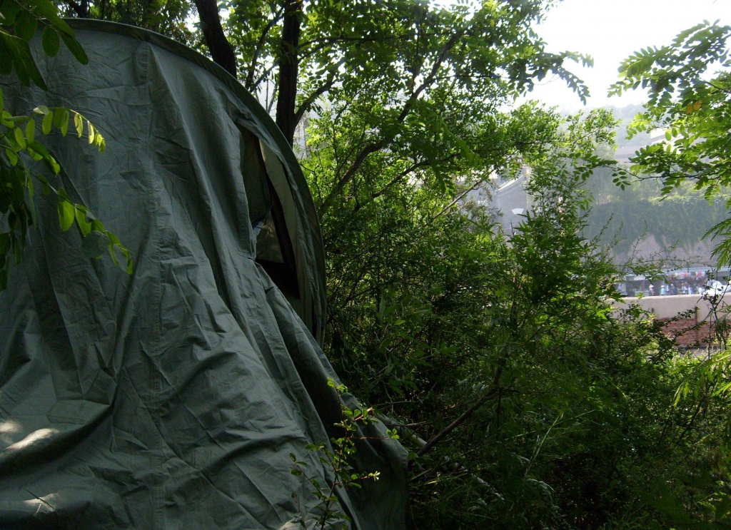 В итоге мы одни, под Китайской стеной, и спать нам негде, потому что вокруг - сплошное залитое асфальтом пространство, окруженное закрытыми ларьками. Сразу за ларьками - крутой склон, заросший какой-то ботвой. Уже лучше, чем ничего. Перелезли через колючую проволоку, нашли в темноте какой-то относительно пологий квадратный метр земли, поставили палатку. Утром оказалось, что в этих кустах была помойка. Вылезали мы оттуда на глазах у кучи китайцев, которые торговали рядом сувенирами.