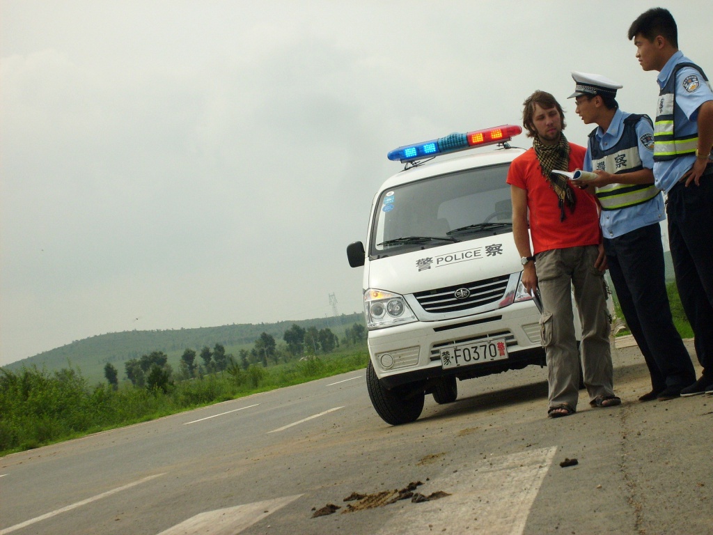 Полиция там выглядит очень обязательной. Столкновения были часто, конфликтов не было никогда. Чаще всего, если тебя замечают на трассе, то молча утрамбовывают в машину и отвозят на вокзал в город (даже если ты только что оттуда мучительно выезжал 4 часа). Поэтому под конец мы начали от них прятаться, чтобы вновь и вновь не оказываться на вокзале. Один раз нас отловили на какой-то проселочной дороге. Мы подумали – всё, сейчас будут «прессовать». Оказалось, они только хотели узнать, какого хрена два белых человека забыли в этой заднице (мы как раз спаслись бегством из маленького китайского поселка, в который нас ночью завез какой-то добрый дядька, накормив в ресторане и оплатив номер в отеле). Мы объяснили, что путешествуем автостопом. Полицейские попросили сфотографировать русские деньги (на память) и разрешения посмотреть, как мы будем стопить машину. В итоге они помогли нам застопить какого-то фермера, который через три километра заглох.