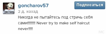 «Никогда не пытайтесь (Покинуть Омск — ред.) под стричь себя сами!!!!!!!!! Never try to make self haircut never!!!!!», — именно так, на двух языках, подписал фотографию Максим Гончаров и выложил на все общее обозрение в свое профиле Instagram. Интересно, что сподвигло Максима, совсем недавно перешедшего из ЦСКА в омский хоккейный клуб, решиться на такой эксперимент?