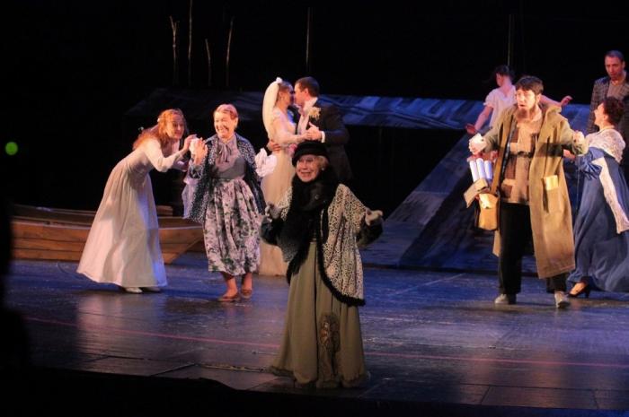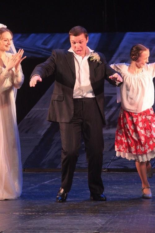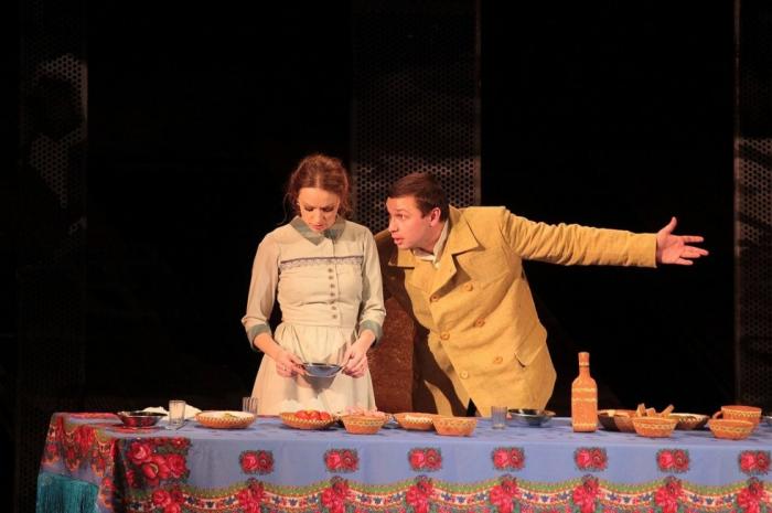 К явным минусам постановки режиссера Евгения Рогулькина, главрежа тюзовцев, можно отнести начальную сцену. Это эпизод свадьбы Катерины и Тихона, и артисты предстают там в полном составе.