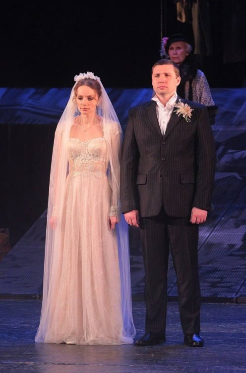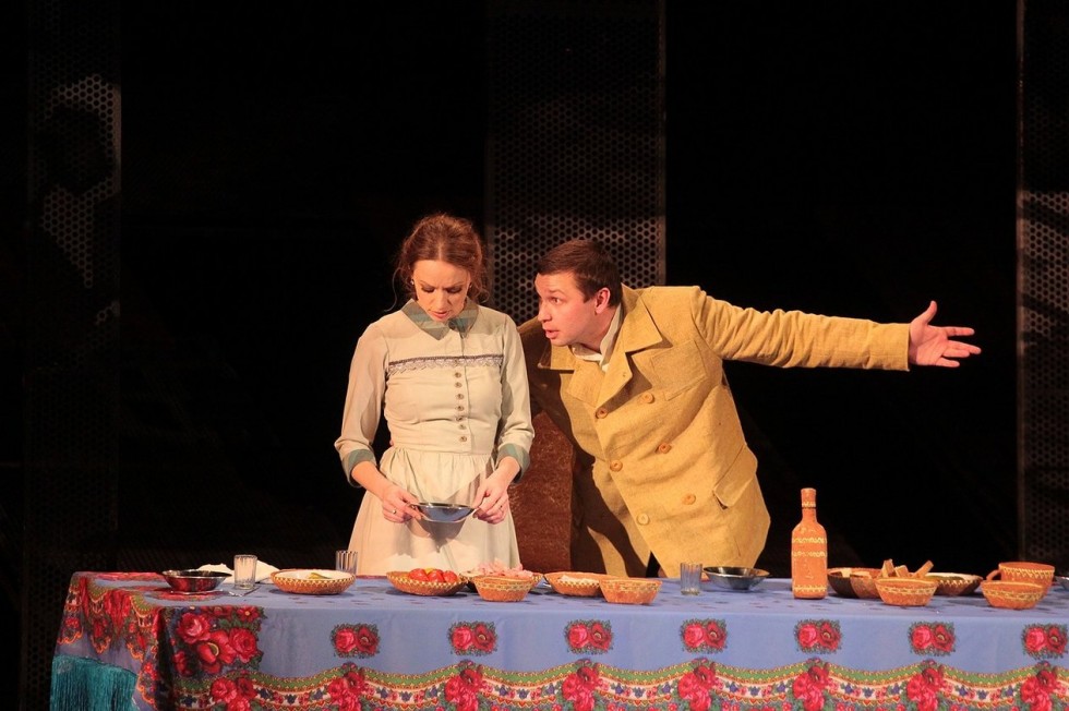 К явным минусам постановки режиссера Евгения Рогулькина, главрежа тюзовцев, можно отнести начальную сцену. Это эпизод свадьбы Катерины и Тихона, и артисты предстают там в полном составе.