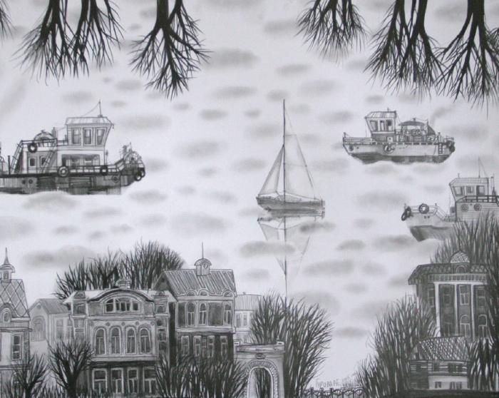 Моя излюбленная тема – пейзаж. Правда, он у меня чаще фантазийный, без привязки к конкретному месту, ведь я считаю себя человеком мира. Мне нравится история: приезжают к нам художники из других городов и говорят: «Что вы все тут в Омске такие разные, креативные: один формалист, другой абстракционист, третий портретист». Я отвечаю: «Вам хорошо – вы живёте в Красноярске или на Алтае, у вас везде красота: что увидел из окна, то и пиши. У нас же сотни километров – степь». Если я только ее рисовать буду, то, наверное, мне очень грустно будет. Я много путешествую; если есть выбор, то предпочту путешествие на своей машине. Очень люблю управлять автомобилем – это момент, когда я могу побыть сама с собой и оглядеться. И фрагменты городской жизни, и меняющаяся картинка за окном часто наталкивают меня на создание графических листов, порой целых графических серий.