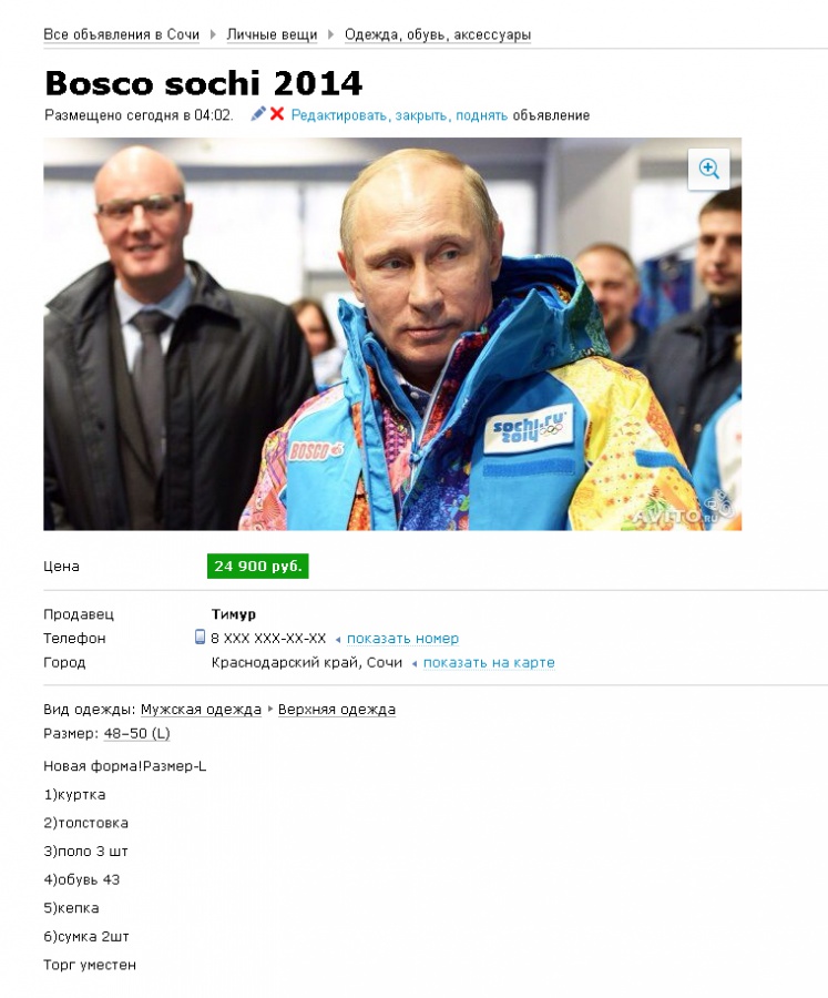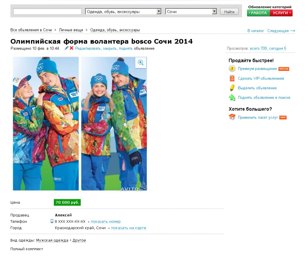 Учитывая, сколько времени волонтеры потратили на то, чтобы попасть в ряды добровольцев (они проходили кастинг и обучение в течение года-двух и около двух месяцев проработали в Сочи на бесплатных условиях), продажа формы для многих – вполне обоснованный поступок. Хотя аппетиты некоторых волонтеров удивляют: полный комплект они продают за 65 000-70 000 рублей.