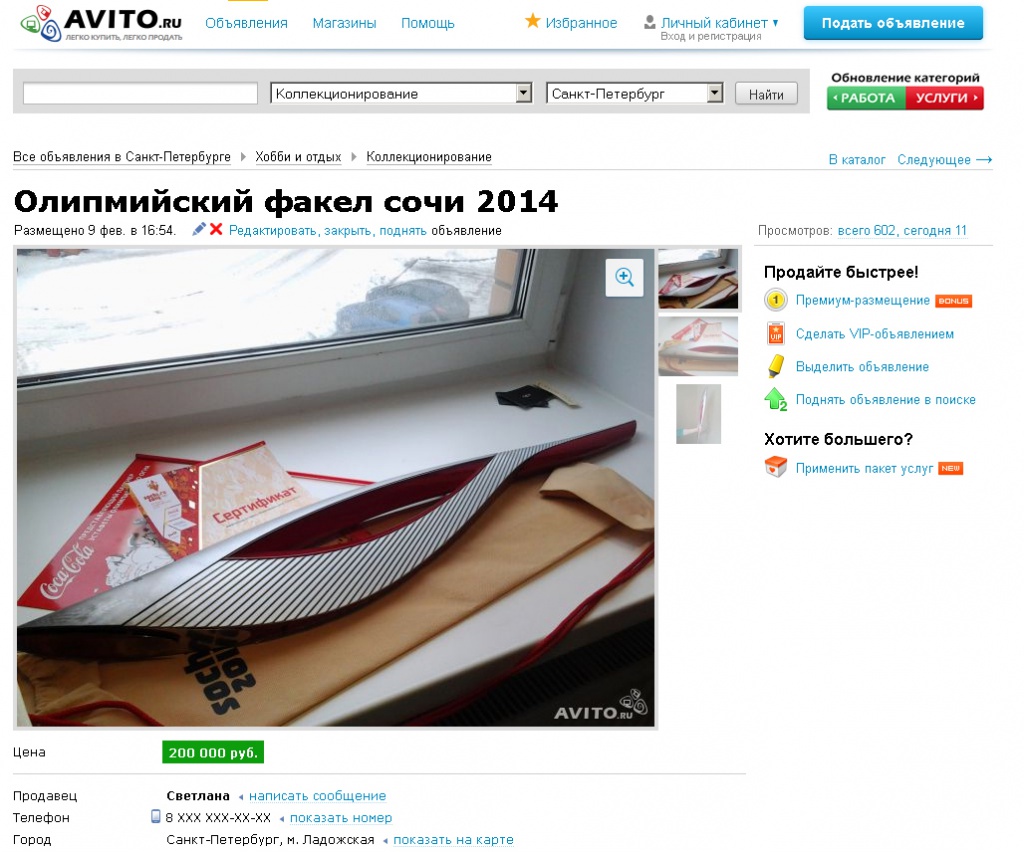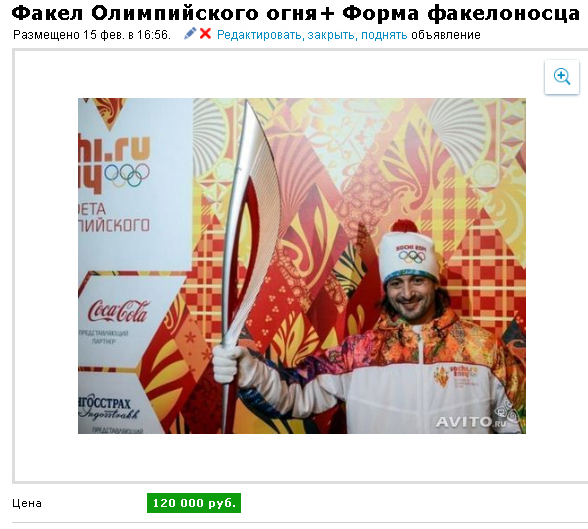 Хотя, если поискать получше, то можно найти варианты и подешевле. Так, один из продавцов предлагает купить факел олимпийского огня и форму факелоносца «всего» за 120 000 рублей.