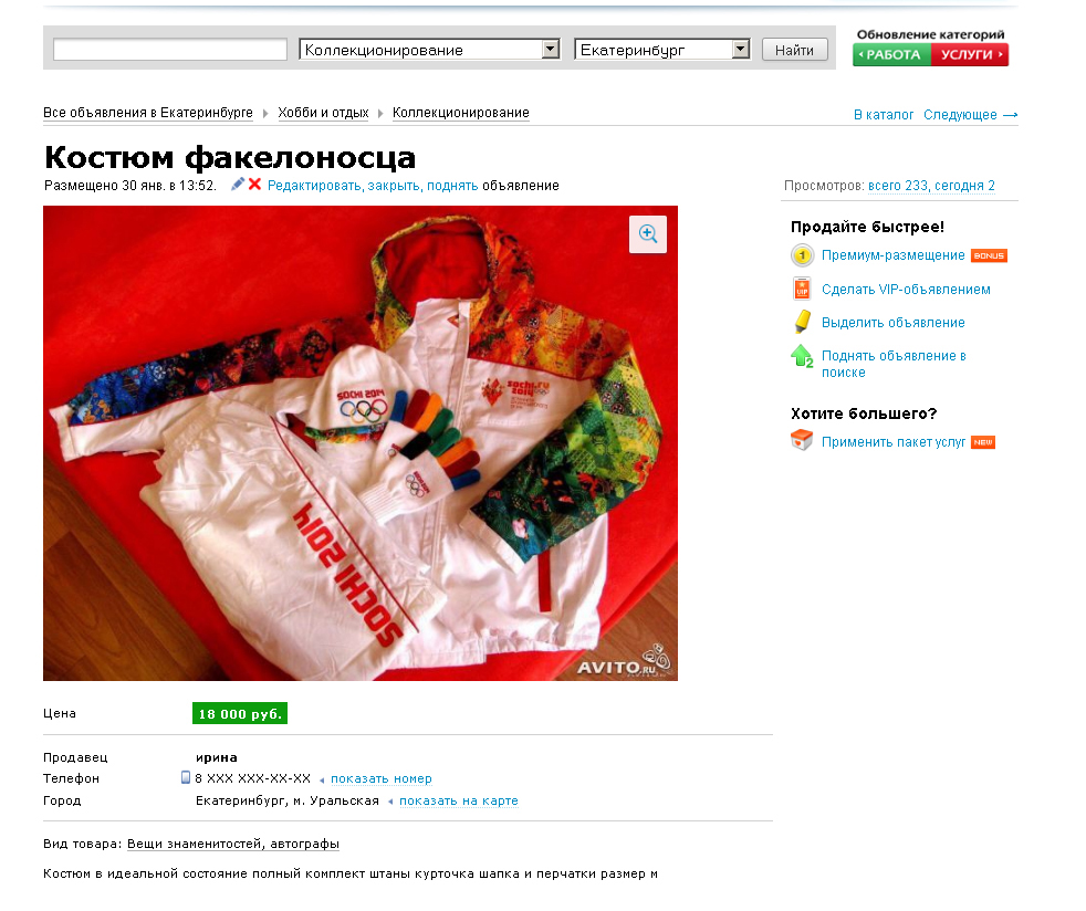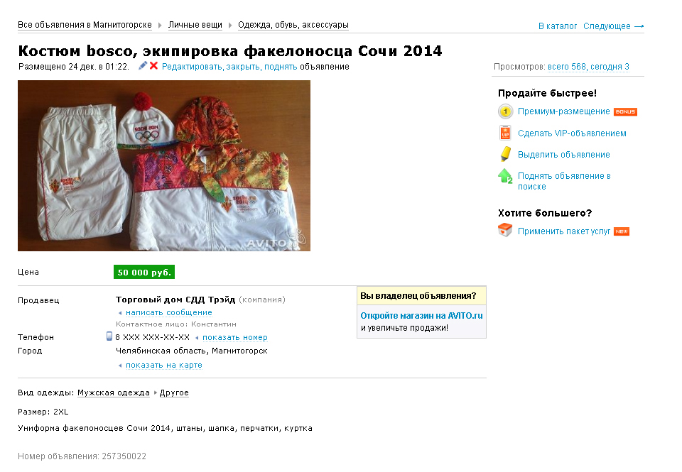 Почему так дорого? Один из продавцов объясняет вполне доступно: «Костюм факелоносца одевался один раз для участия в Эстафете олимпийского огня. Последняя Олимпиада в России (СССР) была аж в 1980-м году, 33 года назад... И кто знает, когда будет в следующий раз. Размер S. Комплект с перчатками. Отправка почтой в любой регион РФ».