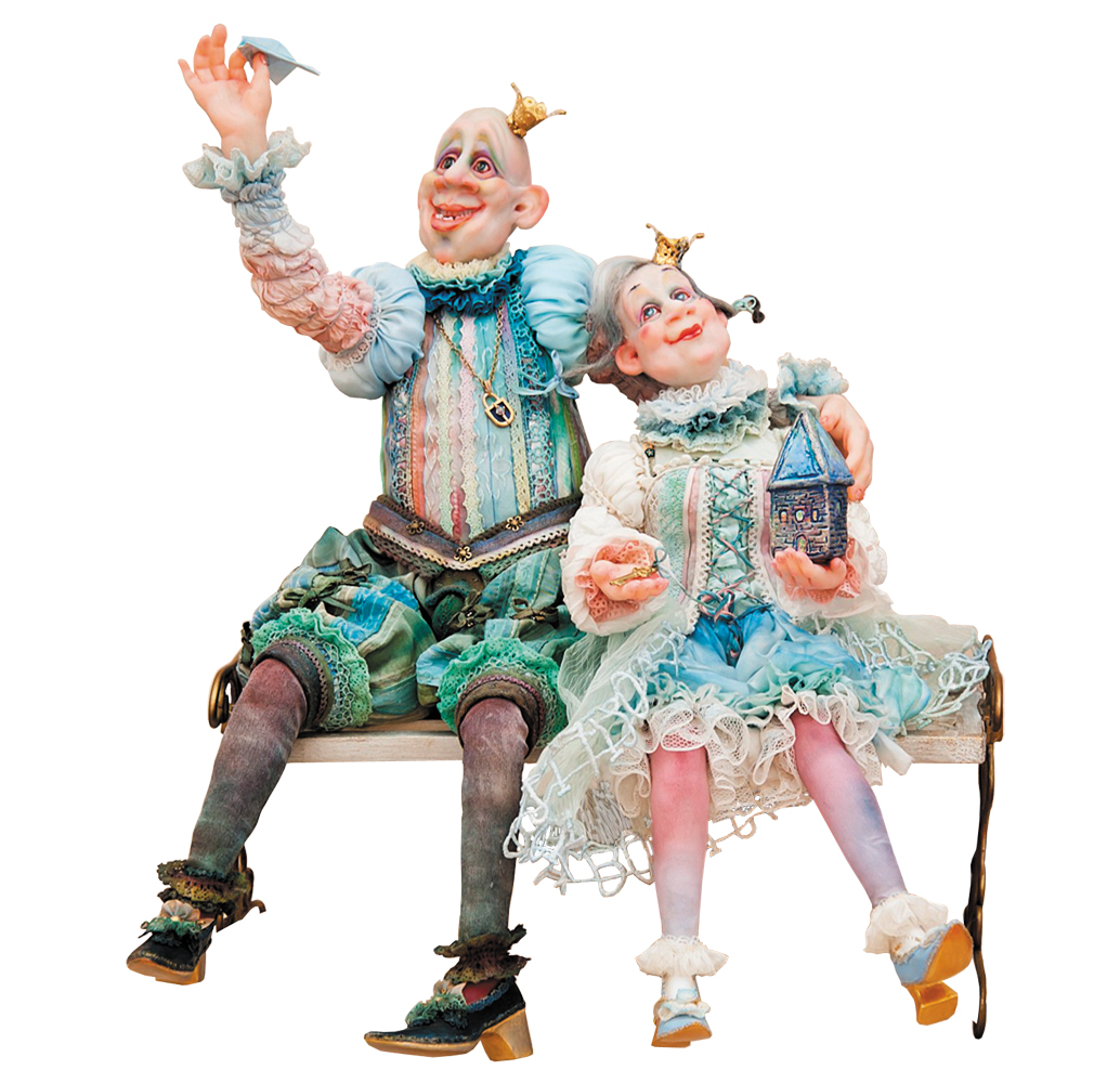 Чета монарших особ, которые прожили всю жизнь вместе и при этом сумели сохранить статус короля и королевы прежде всего друг для друга. Сейчас это большая редкость и удача. Мне кажется, что только наши бабушки и дедушки способны на такие трогательные отношения. У этой парочки получилось стать счастливыми, ведь у них изначально были правильные ориентиры – мужчине быть мужчиной, а женщине – женщиной. Поэтому у королевы в руках ключ и от их дома, и от сердца своего короля. А король держит самолетик – это символ некой миссии, которую выбрал для себя мужчина, потому что без цели, без самореализации мужчина теряет свое «я». Он как бы ведет за собой женщину, а она, в свою очередь – его тыл, без нее мужчина эту миссию не выполнит.