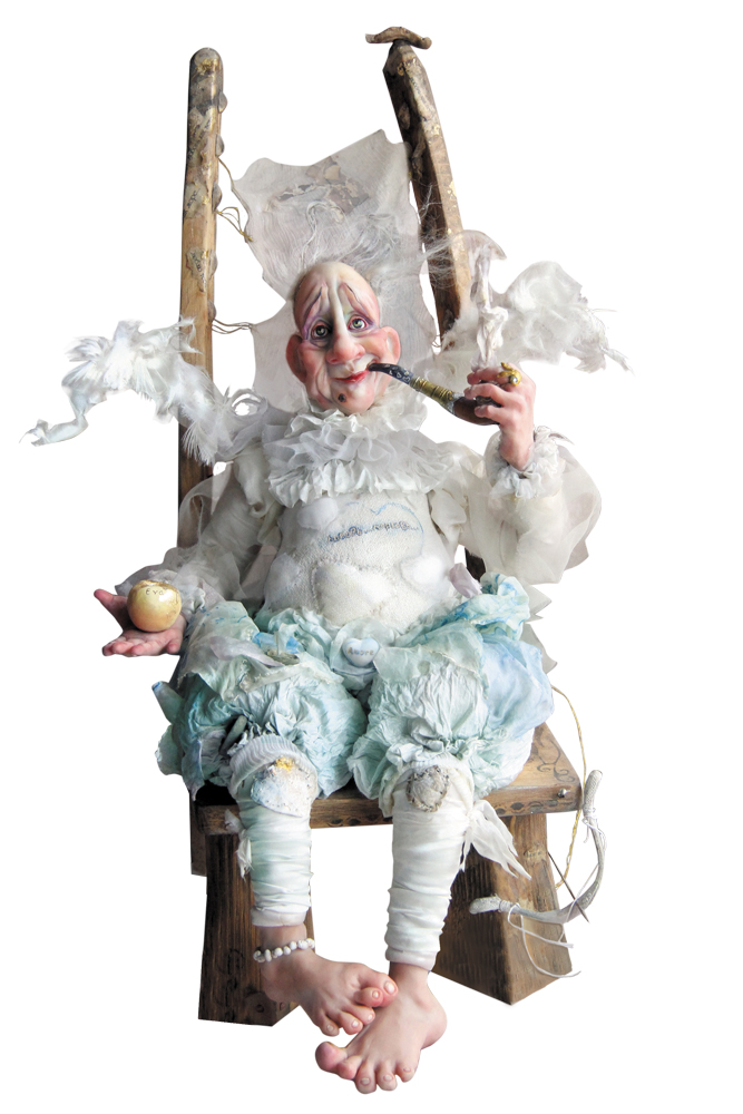 Традиционно Купидона изображали иначе, а у меня это старичок, потрепанный жизнью, ведь любовь «стара как мир» и ей «все возрасты покорны». Любовь омолаживает и возносит, поэтому мой Купидон весь в белом и у него детские глаза. Он курит трубку: все влюбленные на определенном этапе как бы находятся в состоянии легкого наркотического опьянения. На пальце у Купидона – значок «Плейбоя»: телесное влечение, страсть – тоже приятная составляющая любви. Любовь как море, путешествие по которому меняет человека к лучшему или худшему, открывает в нем новые берега, поэтому штанишки Купидона стилизованы под морские волны и по ним плавают кораблики.