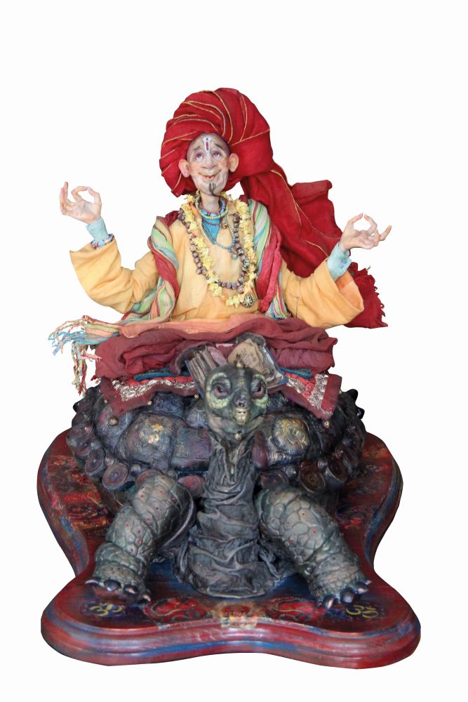 Мне хотелось показать единство противоположностей – духовного и материального. Старичок с книгой – своеобразный символ души. У него детские глаза, устремленные в небо, это говорит о том, что душа человека всегда молода и открыта, как у ребенка. И в то же время сам он пожилой человек, этим я хотела подчеркнуть, что она еще и бессмертна. Черепаха – символ земли, материальности, телесности. Обе стороны человеческой жизни представлены в этой кукле в состоянии гармонии.