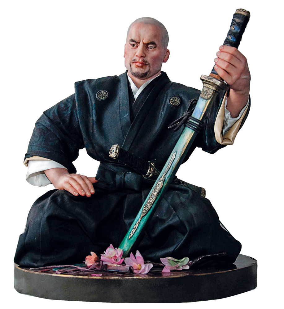 Эта кукла была сделана для одной из наших заказчиц, муж которой увлекается японской культурой. Перед тем как приняться за работу, я посмотрела фильм «Последний самурай» с Томом Крузом в главной роли и вдохновилась образом предводителя самураев – благородным воином, отрешенным, сосредоточенным. Пришлось основательно потрудиться над костюмом – в нем все достоверно до самых мелочей. Я специально искала информацию в интернете – какой должна быть верхняя и нижняя одежда, какой пояс, на какой узел он завязывается… То же самое и с мечом – его форма, изображенные на нем символы – стилизация по описаниям и фотографиям с настоящих самурайских мечей.