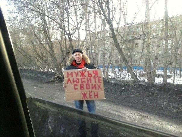 На этой неделе в сети Internet омский пользователь «Вконтакте» разместил фотографию с одиночного пикета. Виталий Ковтуновский запечатлел человека на Красноярском тракте с картонным обращением к мужьям «Любите своих жен». Как сообщает Ковтуновский, пикетчик стоял в одной линии с проститутками.