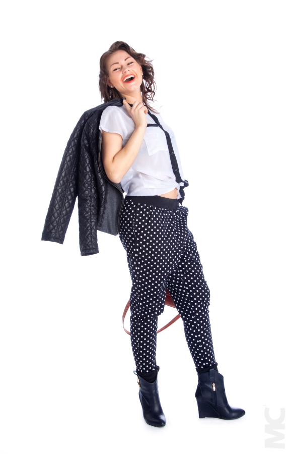 Это вечернее платье мне сшила моя хорошая подруга – дизайнер Марина Клипенштейн. Она шьет только женскую одежду и делает акцент на натуральные ткани. Как вы заметили на нем присутствует мой любимый принт горох – куда же без него. Это платье я пока надевала один раз, и меня сразу обалденно облили вискарем.