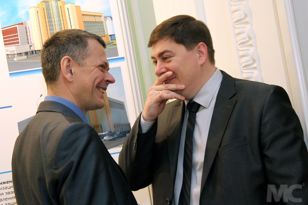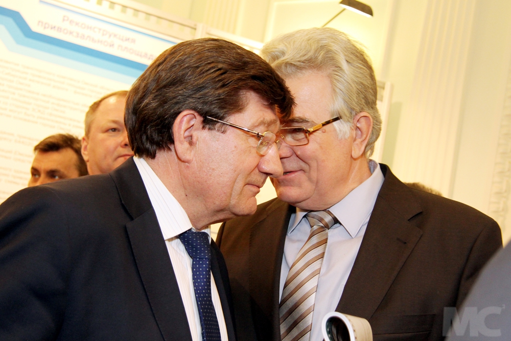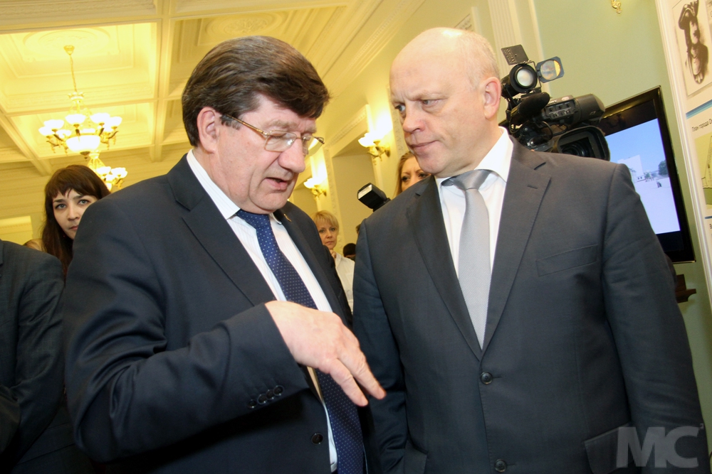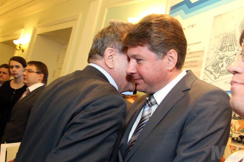 Председатель областного Заксобрания Владимир Варнавский что-то по секрету рассказывает мэру Вячеславу Двораковскому.