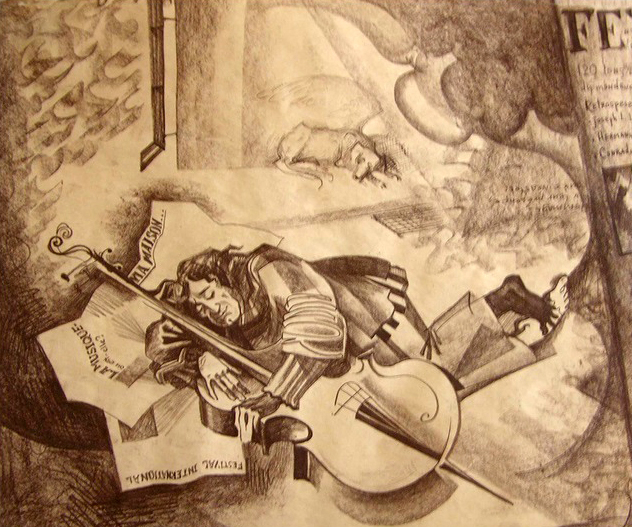 Идея родилась случайно. Мне нужно было попробовать мелок сепии, разрисовать на ненужной бумаге, положив его плоско, а не торцом. Таким образом я и вывела эти скрипичные силуэты. А потом... мысль пошла, и картинка получилась сама собой. Позже она стала обложкой к нашему альбому «Герда».