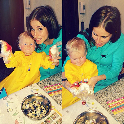 Невестка Федора и Светланы Бондарчук Тата красила перепелиные яйца вместе со своей годовалой дочкой Маргаритой.